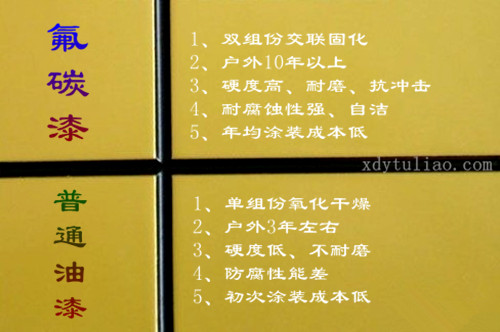 氟碳漆與普通漆有什么區(qū)別? 本文從一下幾個方面全面的比較了氟碳漆與普通漆的區(qū)別比較:樹脂、固化成膜、耐候性、機(jī)械性能、耐溶劑性能、耐熱性、使用期限、市場價、可涂布面積、每平米每年的成本