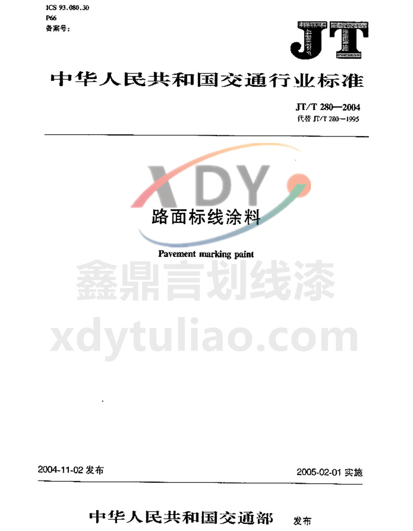 JT/T 280-2004路面標(biāo)線涂料標(biāo)準(zhǔn)是防腐涂料小編照搬JT/T 280-2004《路面標(biāo)線涂料》紙質(zhì)版內(nèi)容,大家可以放心參考。更多防腐涂料執(zhí)行國家和行業(yè)標(biāo)準(zhǔn)等防腐涂料相關(guān)信息可以參考官網(wǎng):utocar.com ICS 93.080.30 P66 JT 中華人民共和國交通運輸行業(yè)標(biāo)準(zhǔn) JT/T 280-2004路面標(biāo)線涂料Pavement