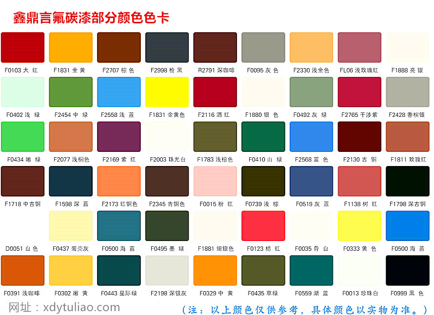 氟碳漆顏色有很多種,光澤上分為亮光,平光,啞光,無光;常用的金屬色氟碳漆顏色有:金色、銀白色、銀灰色,香檳銀、藍(lán)銀等,常用的氟碳漆實色有:大紅色、灰色、白色、中綠色、中黃色、藍(lán)色、紫色、桔紅色、黑色、酒紅色、棕色等。鑫鼎言客戶可以選擇氟碳漆色卡有:歐標(biāo)RAL色卡(RAL國際色卡、勞爾色卡)、鑫鼎言氟碳漆色卡、國標(biāo)GSB漆膜顏色標(biāo)準(zhǔn)色卡(GSB05-1426-2001)、金屬漆色卡。客戶可以根據(jù)底材