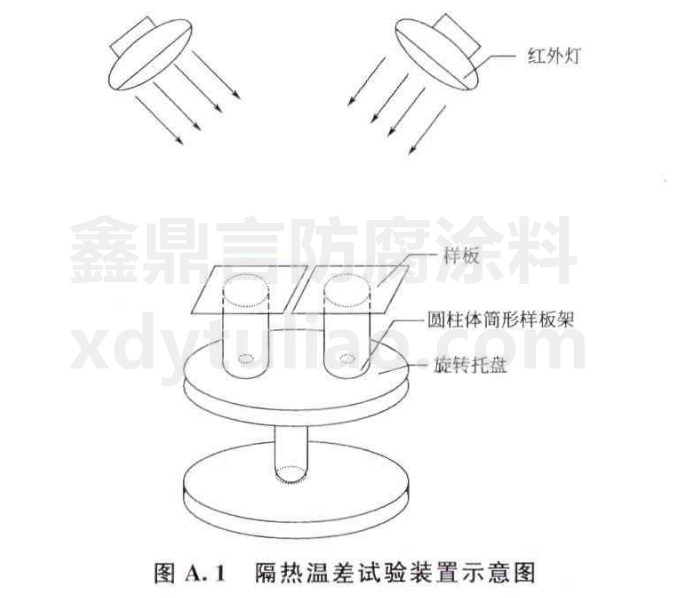 A.3.2、試驗在18℃—27℃的環(huán)境條件下進(jìn)行。在旋轉(zhuǎn)托盤上放置圓柱體筒形樣板架,圓柱體筒形樣板架的中心應(yīng)對準(zhǔn)托盤上圓孔的中心;將1塊試板及1塊空白試板放在圓柱體筒形樣板架上,兩塊板之間間隔5mm,試板有涂層的面向上,空白試板經(jīng)過噴砂或拋丸的面向上;在旋轉(zhuǎn)托盤的上方0.5m處,安裝2只紅外燈,紅外燈與旋轉(zhuǎn)托盤邊緣的水平距離為15cm,紅外燈的加熱面軸向與試板平面成75°。
